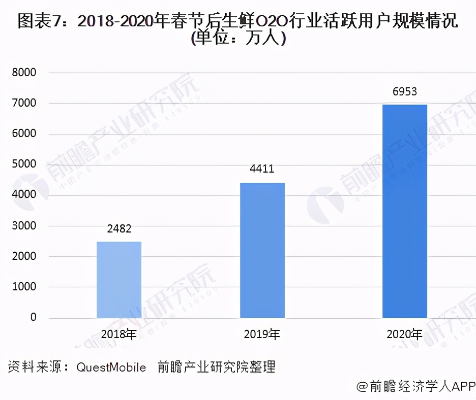 近年来,随着生鲜商品从菜场向商超、电商渠道转移,本地生活O2O的快速发展,生鲜O2O用户规模不断增长,2020年新冠疫情爆发,人们积极响应居家隔离防疫措施,减少外出采购,生鲜O2O迎来用户规模的快速增长,生鲜O2O平台用户规模大增,根据QuestMobile数据显示,春节复工后30天,生鲜O2O行业活跃用户规模达近7000万人。