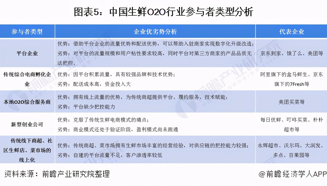 目前我国生鲜O2O行业的主要参与者类型包括平台企业、传统综合电商孵化企业、本地O2O综合服务商、新兴创业公司、传统线下商超、社区生鲜店、菜市场的线上化等。