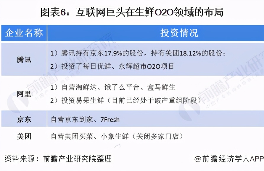 与此同时腾讯、阿里、京东、美团等互联网巨头近年来也加大对生鲜O2O的投资,在生鲜O2O领域均有所布局。
