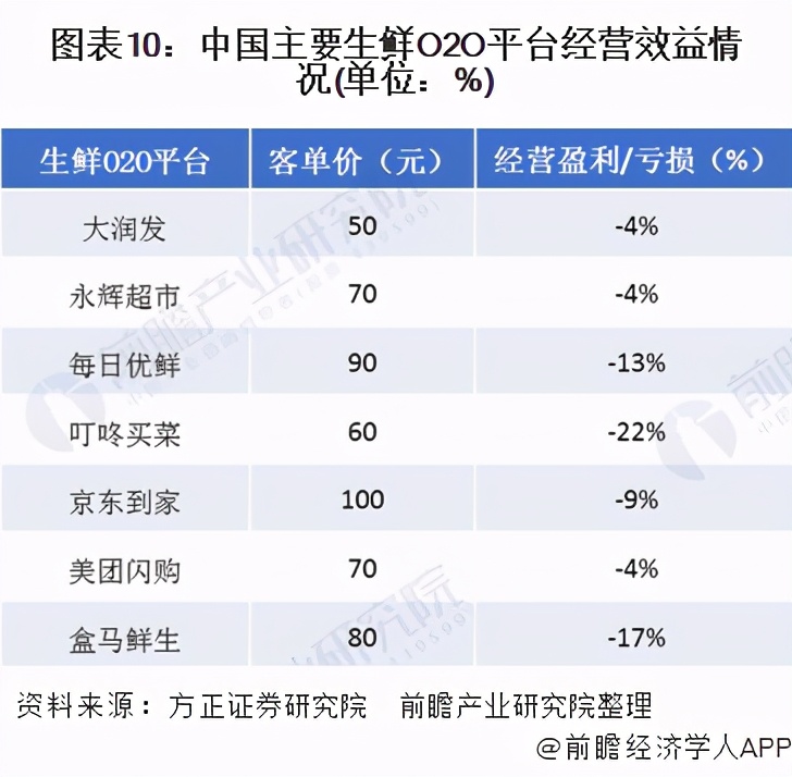 目前,我国生鲜O2O行业的获客能力正在逐渐提升,用户消费习惯正处于快速培养阶段,但值得注意的是,我国生鲜O2O的客单价较低,大部分平台的客单价均未达到盈利平衡点。尽管在生鲜O2O快速扩张的过程中,我国生鲜O2O行业的规模化能力正在不断提升,但规模效应还有待提高,总体来说,目前我国生鲜O2O行业盈利能力较弱,更准确的来说,根据我国主要的生鲜O2O平台公布的经营数据显示,目前我国生鲜O2O行业经营效益不佳,行业整体处于亏损状态,行业中代表性生鲜O2O平台的盈利情况如下: