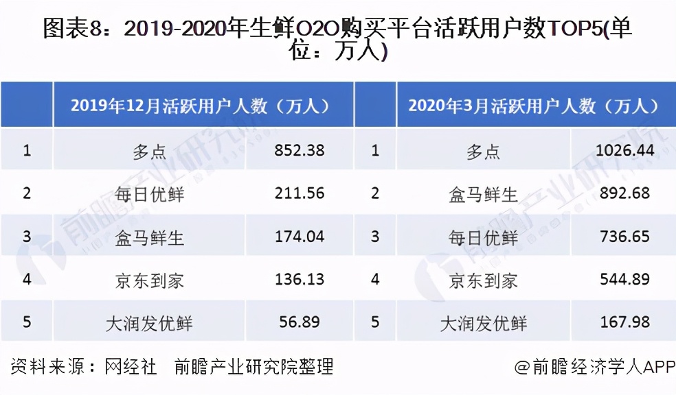 根据网经社公布的数据显示,截至2019年12月生鲜O2O平台活跃人数TOP5分别为:多点、每日优鲜、盒马鲜生、京东到家、大润发优鲜,多点、每日优鲜、盒马鲜生和京东到家平台活跃用户人数均超百万,其中多点活跃用户人数高达852.38万。2020年新冠疫情爆发后,生鲜O2O平台活跃用户人数快速增长,其中多点活跃用户人数仍然位居首位,盒马鲜生、每日优鲜、京东到家和大润发优鲜的活跃用户规模紧随其后。