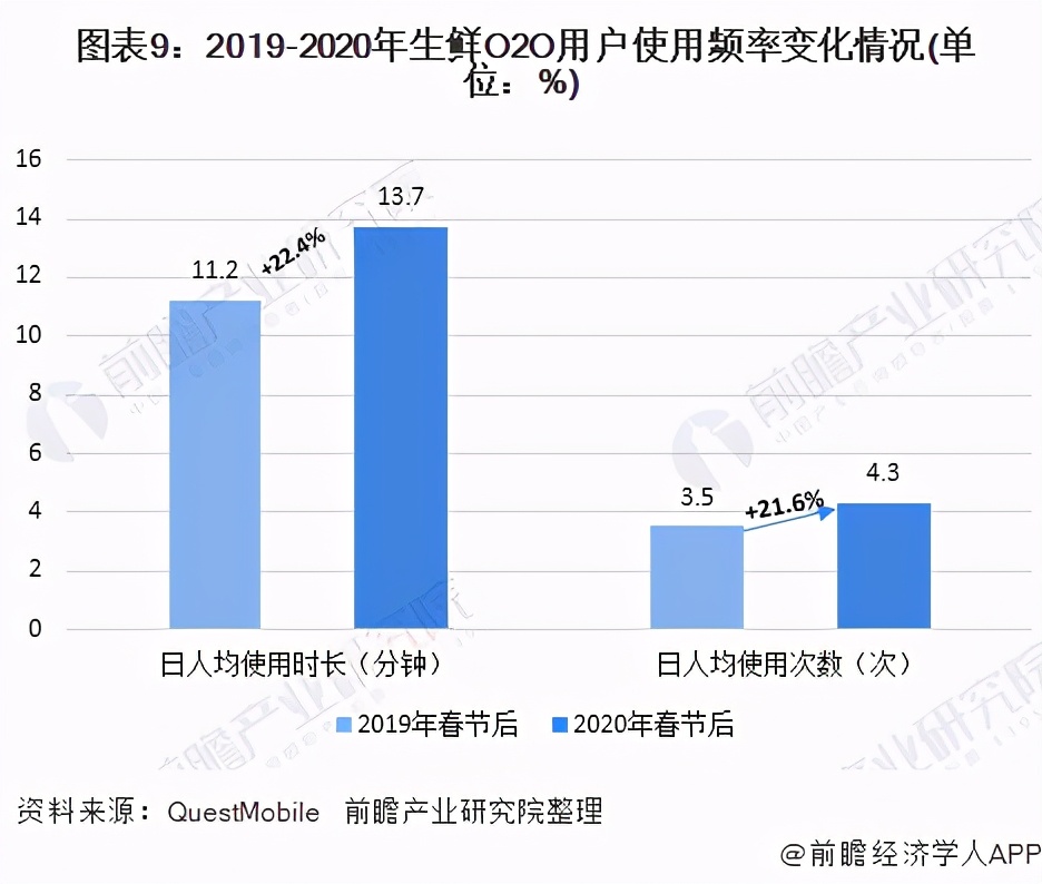 疫情影响下,生鲜O2O用户使用粘性快速上升,根据QuestMobile数据显示,2020年春节后生鲜O2O行业日人均使用次数和日人均使用时长实现双增长,增幅均在20%以上,其中日人均使用时长增长至13.7分钟,日人均使用次数增长至4.3次。
